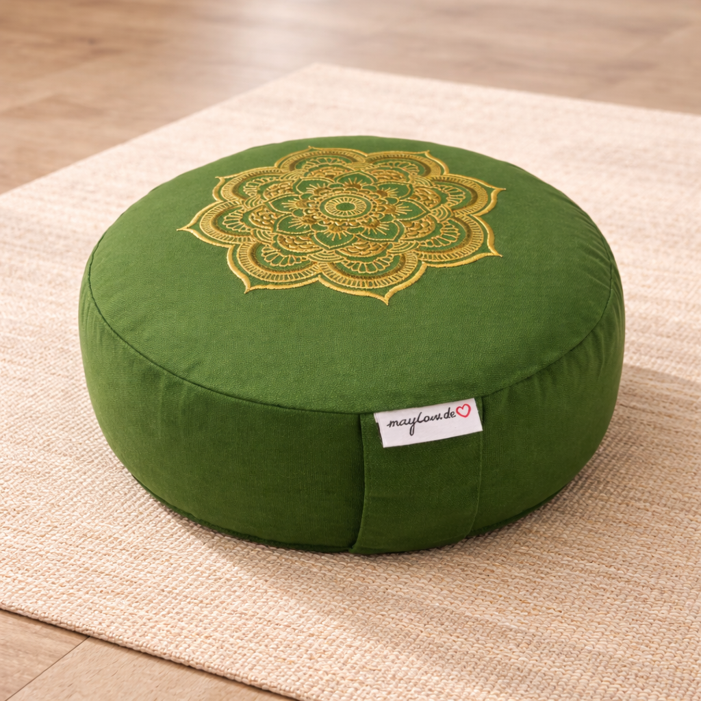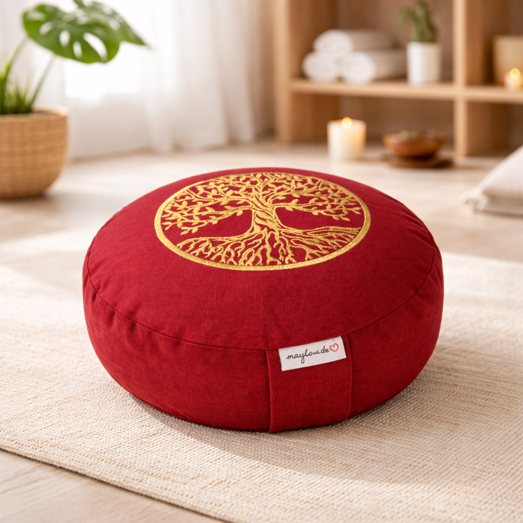 Ein Meditationskissen, auch als Zafu bekannt, unterstützt eine komfortable Sitzhaltung während der Meditation. Es hilft, die Wirbelsäule gerade zu halten und den Körper zu entlasten, was längere Meditationssitzungen angenehmer macht.
