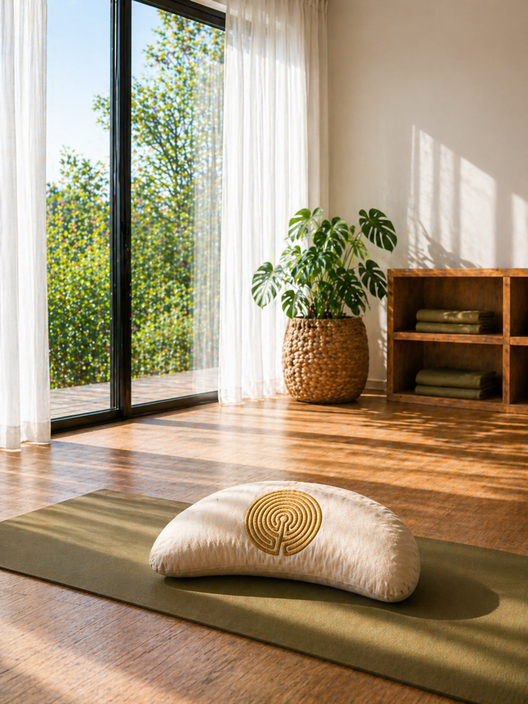 Erlebe eine tiefere und entspannende Meditation mit unserem exklusiven Meditationskissen, das mit einem kunstvoll gestickten Labyrinth-Motiv verziert ist.