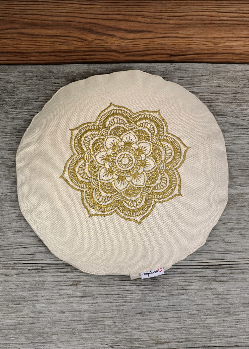 Die feine Mandala-Stickerei in edlem Gold macht dieses Kissen zu einem besonderen Highlight in deinem Achtsamkeitsraum.
