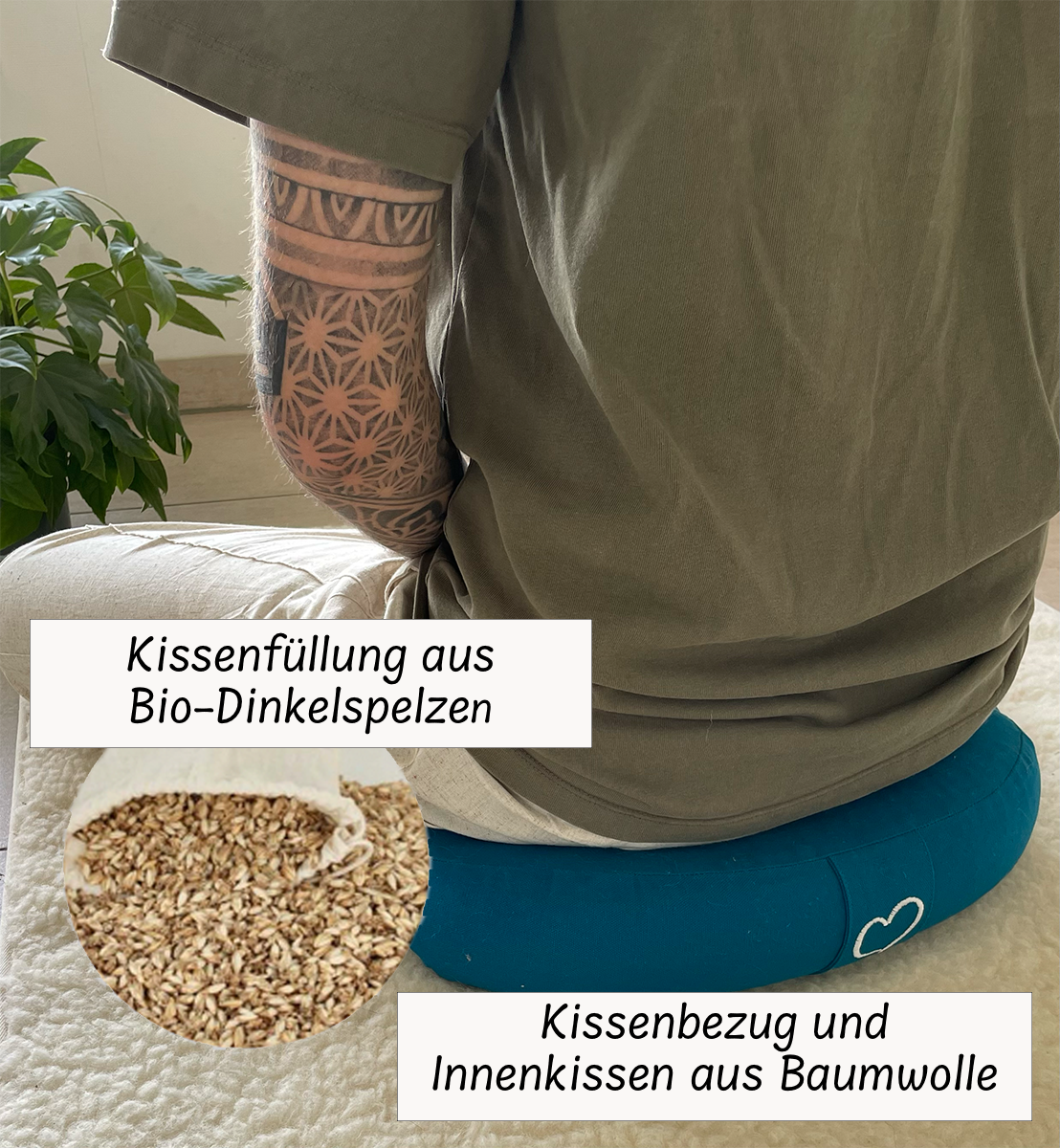 Unsere Meditationskissen sind mit Bio-Dinkelspelzen gefüllt. Dieses natürliche Material passt sich perfekt deiner Körperform an und bietet eine stabile und bequeme Sitzfläche.